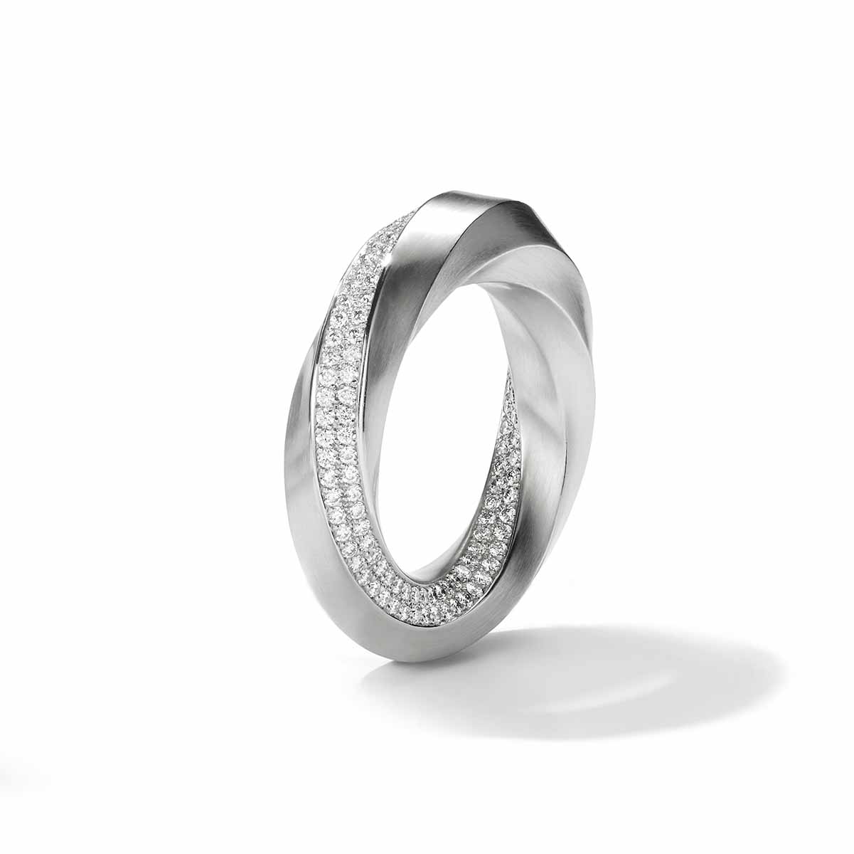 Gracefully twisted around its own axis, a hexagonal band has been shaped into an exceedingly elegant bracelet and ring featuring a vibrant transitioning of edges and even surfaces from the visible to the invisible. Following the course of the platinum band’s twist, brilliant-cut diamonds harmoniously combine with the precious metal to form an extravagantly compelling aesthetic entity: a genuine sculpture for the wrist and for the finger.